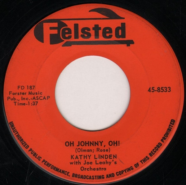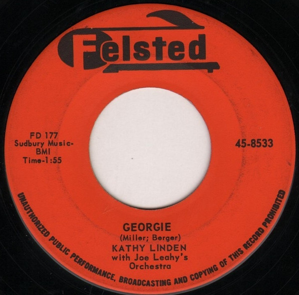 Kathy Linden with Joe Leahy's OrchestraUS盤 58年。前年デビューの声もお顔も可愛いシンガー、ケイシー・リンデン嬢のFelsted に移籍しての3rdシングル。日本では59年の「Heartaches at sweet sixteen (悲しき16才)」のヒットで有名ですね。BillyだのJimmyだのタイトルに男子の名前が入っている曲がヒットしている彼女だけに、今回も両面名前で攻めてみたよ!両面とも、ロック以前のポップス純度100%!ちょうキュートでオススメ!! genre = オールディーズ Oldies