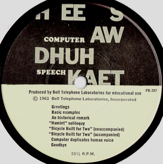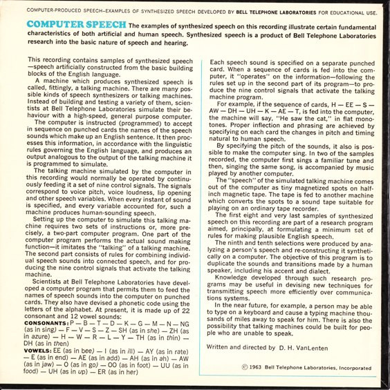 Bell Telephone Laboratoriesエレクトロニカの作家によって多く使われているプログラムMAX/MSPの名前の由来にもなっている、「コンピュータ音楽の祖」MAX MATTHEWSは1957年にIBM704(1秒間に40,000回の加算を実行出来たマシン)を使って世界初の音声合成プログラム「MUSIC I」を開発した。このレコードはベル研究所からリリースされたそのデモンストレーション盤。「ハムレット」の一節の朗読や「Bicycle Built for Two」を歌っています。片面のみですが8トラックの収録です。 #9224