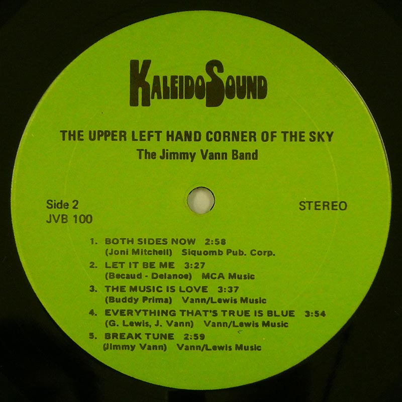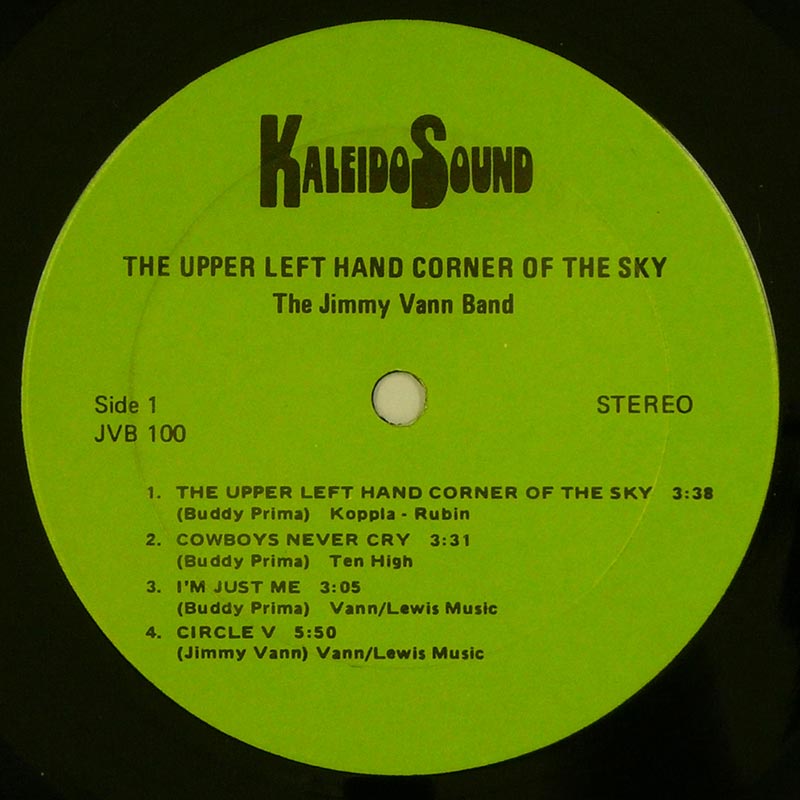 Jimmy Vann Bandこのいかにもローカル自主盤って感じのジャケットにつつれたアルバムの1曲目を聞いて誰もが驚くだろう。それがタイトル曲の"The Upper Left Hand Corner Of The Sky"で、曲のクオリティ、アレンジ、コーラスなど、この1曲だけでも欲しくなってしまう様なアルバム。ローカルのバンドにありがちな事だが、曲調、カバーなどフォーク,ジャズ、ロックと収められている内容はバラバラながら、他の曲もそれなりに楽しめるところは特筆ものである。 genre = ソフトロック基本編 Sunshin Pop Well-known