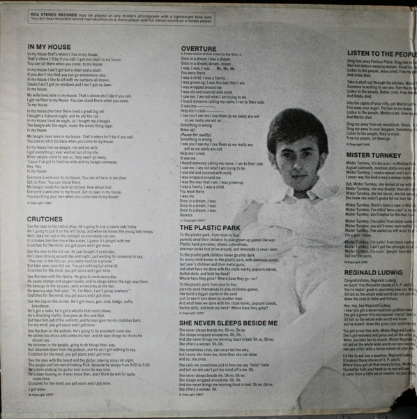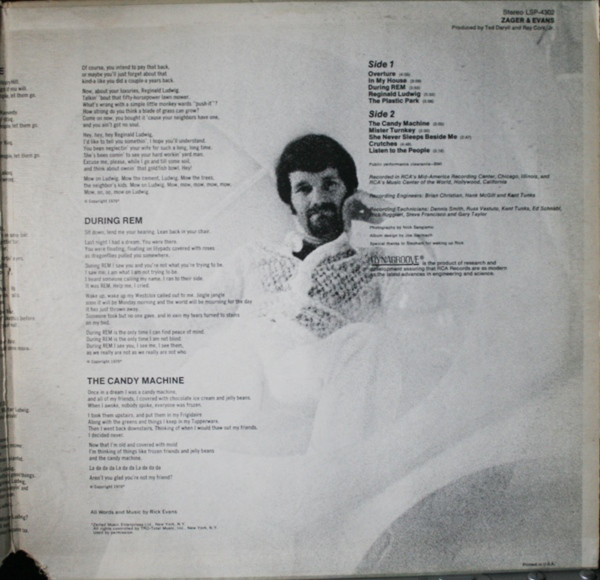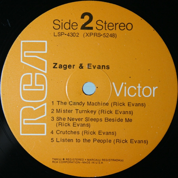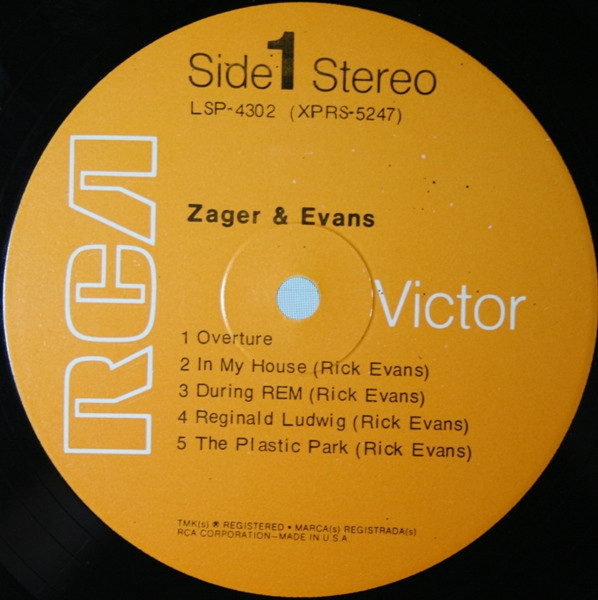 Zager & Evansシールド!"In the year 2525"のヒットで知られる Denny Zager と Rick Evans のデュオグループの 2nd。モーグ使用など凝ったアレンジで聴かせるソフトサイケ好盤。独特の浮遊感を漂わすA5"The plastic park", B1"The candy machine"、ソフトなフォークロック感のB2"Mister turky"等。まずは本当に夢を見ているような、もしくはラリってるような、エフェクティヴなコラージュナンバーA1 "Overture"を聴いてぶっ飛べ!。 #16906