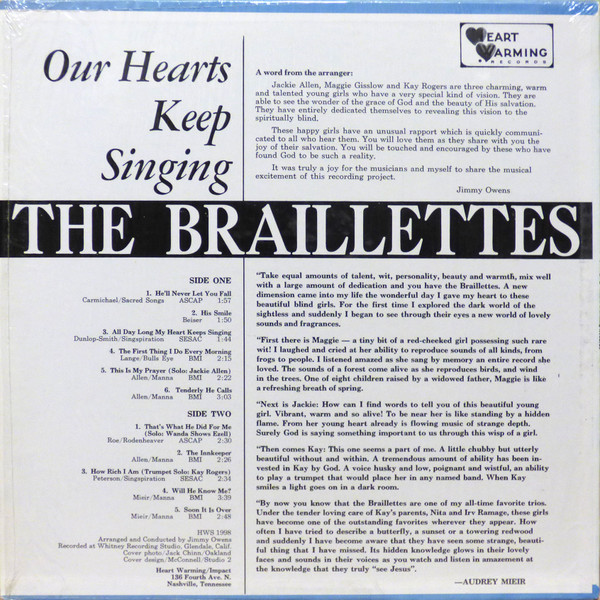 The Braillettesアメリカのビザールジャケファンの中では最も有名なアルバム。このジャケの存在が好事家たちに与えた衝撃は大きく、WikiPediaにも掲載されている。カルフォルニアの3人の「美女」のうち、少なくとも二人は盲目。意外に、と言ってしまっては申し訳ないけど、内容もなかなか素晴らしく、針を降ろしジャケを見て声を聴きもう一度ジャケを見るとより多層的に楽しめます。Lightレーベルで活躍する大御所、Jimmy Owensのチェンバージャズ的な編曲もぐっじょぶ! #16916