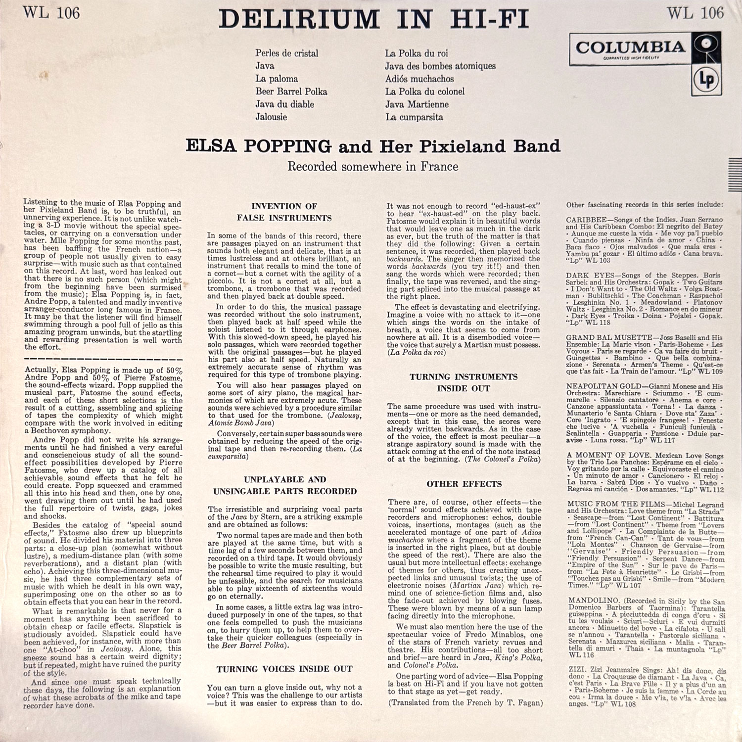 Elsa Popping & her Pixieland BandSMSPL-L 58年 Andre Popp の変名。"Love is Blue (恋は水色)" で知られる Popp が、クリスチャンヌ・ルグランの夫で Swingle Singers 等のエンジニア、レコーディング・プロデューサーの Pierre Fatosme(レコーディング機材やテープ操作によるエフェクト等を担当)とのコラボレーションで作り上げたストレンジでポップな大問題作! イラストは William Steig。 #16939