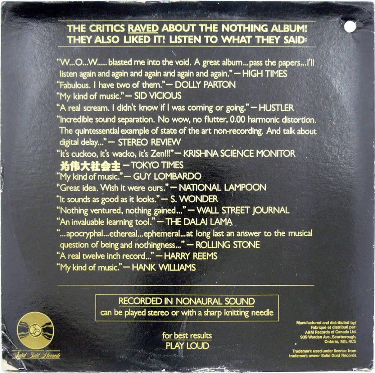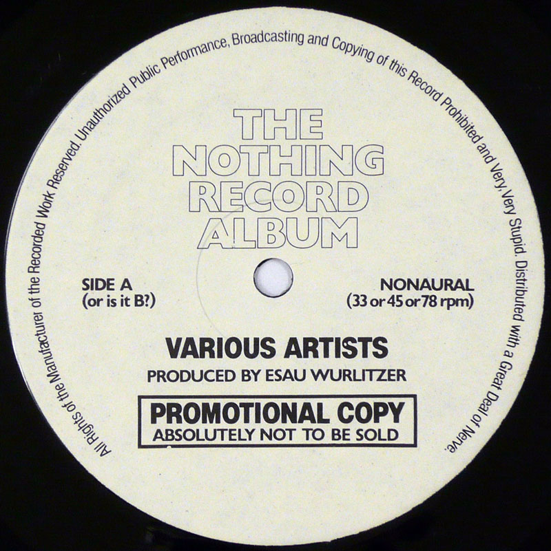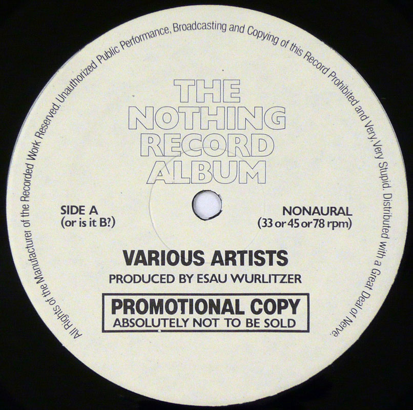 V.A.エサウ氏が特許取得した Vicks Silentium 録音システムにより実現した画期的 Nonaural sound 無音レコード!そんな特殊録音の他、内袋の使用案内でこのレコードはお皿、カッター、ピザ生地などへの使用もお薦めされてる多目的円形盤です。そしてジャケには信憑性も皆無な以下の推薦コメントが紹介されてます、「僕の好みにぴったり。」シドヴィシャス、「見かけも音もグー。」S. ワンダー、「音楽における存在と無についての問題がついに...」ローリングストーン誌、「本物の30センチレコード...」ハリーリームス、他。同じく録音参加者として以下の名が挙がっています。ジミヘンドリックス、ブライアンジョーンズ、スチュサトクリフ、ローレンスオリヴィエ、他。トロントのコメディアン Jim Tuck が仕掛け人の模様。 genre = 菊名 NonVinyl