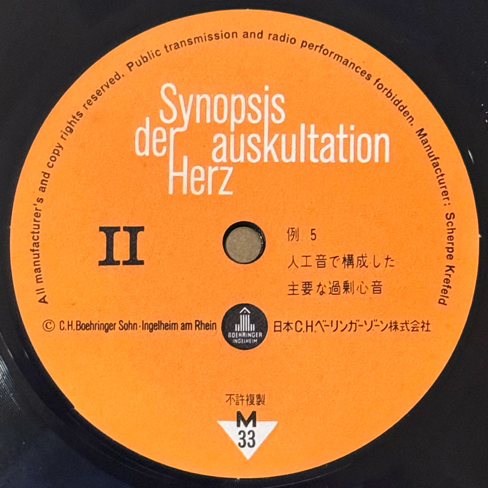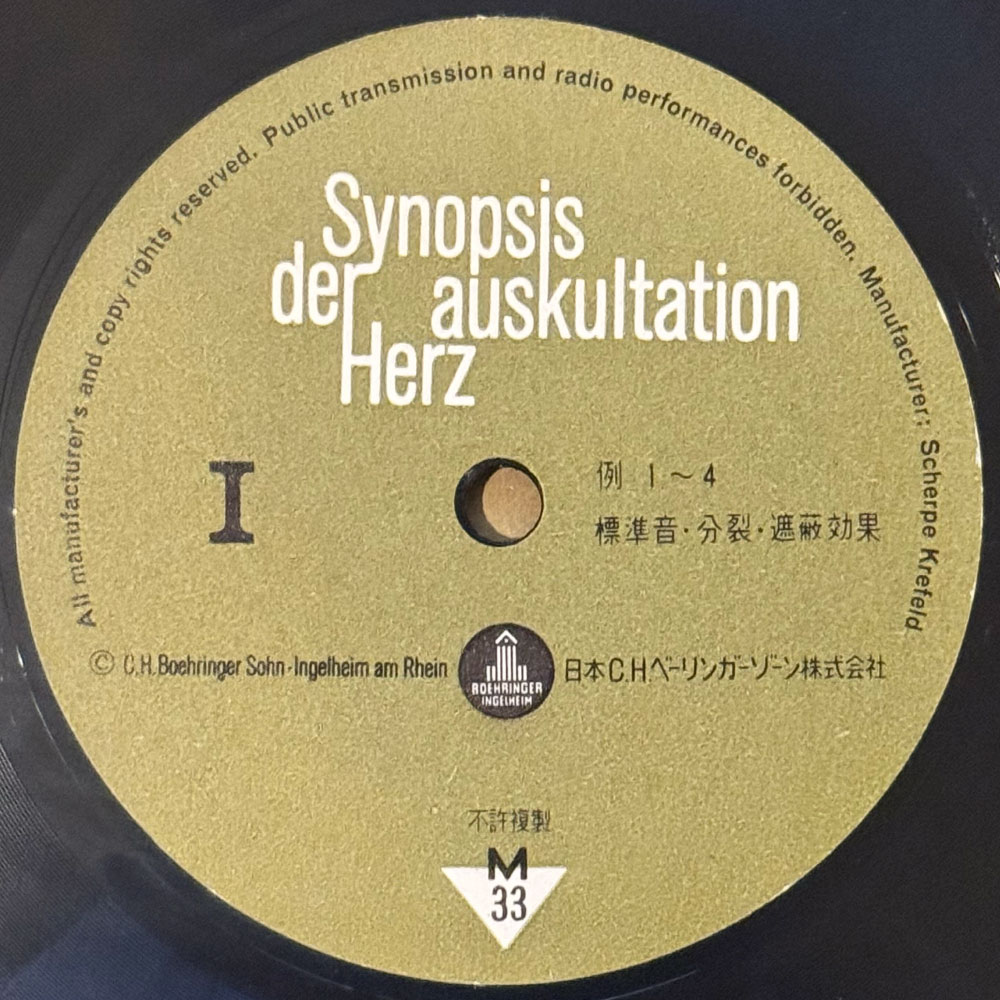 日本にもちゃんと医療系円盤が存在するんですね!田辺製薬による心臓の聴診ソノシート。サウンドチェックから始まり、色々な心音と、人工音で構成された主要な過剰心音など収録。日本人の生真面目さが伝わるクールなナレーションが逆に怖いです。詳細なライナーブック付き。 #15986