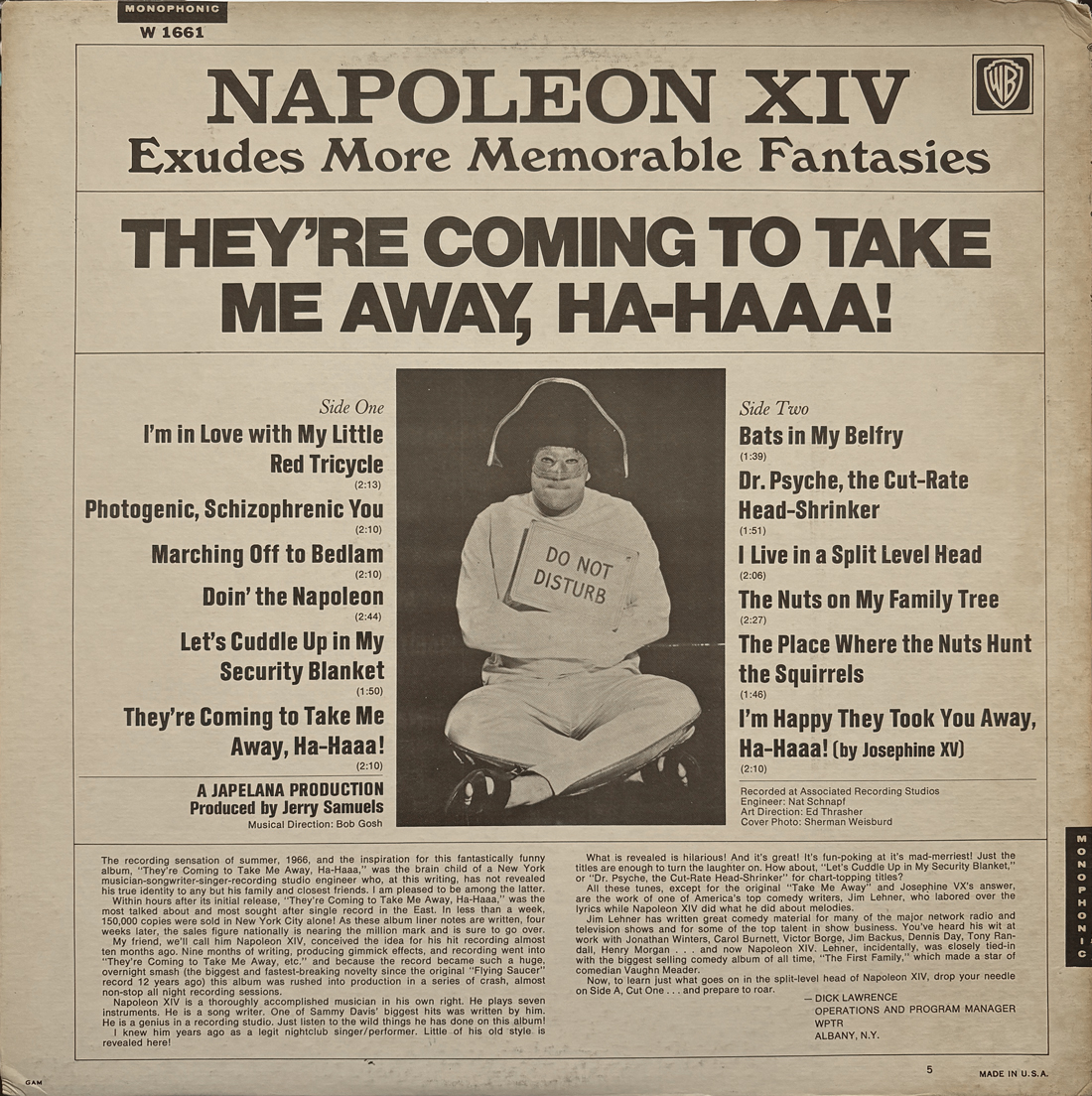 タイトル曲が何の間違いか世界中でヒットしてしまった「ノベルティの王様」ナポレオン14世ことJerrold Samuelsの1stアルバム。実はサミーデイヴィスJrのヒット曲なども書いているSSWかつプロデューサー、エンジニアという人物。おもろ曲と同時に入る歌モノはどれも良曲ばかりで、才人ぶりがよくわかります。ただやはりどこか病んでいた部分はあったようで、2ndアルバムは歌詞の内容があまりにエログロすぎてワーナーからリリースを拒否され、最近50年ぶりにリリースされたりした経緯もあったりします。最後トラックにはJpsephine XIという女性による公式アンサーソングも収録されています。