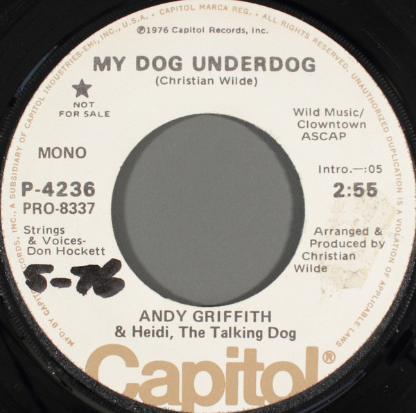 Andy Griffith & Heidi, The Talking Dogアメリカでは誰もが知る俳優・タレントAndy Griffithが喋り、子供達が歌い、愛犬が吠える愛犬愛溢れるノベルティソング。A面ステレオ、B面モノラルです。 #16811