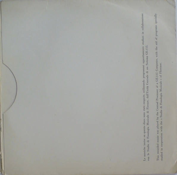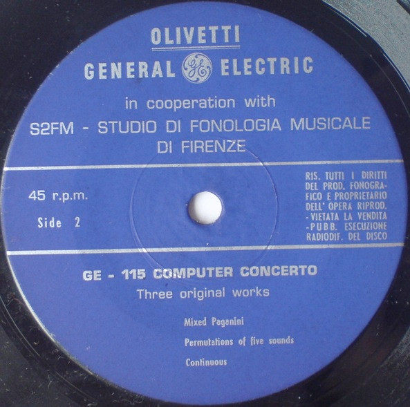 Studio Di Fonologia Musicale Di Firenzeタイプライターで知られるオリベッティ社が、あのGeneral Electric社のコンピュータGE-115を使って新年の贈り物用に制作した濃厚な電子音に溺れる7曲入りシングルです。制作はイタリアの音楽工房で、バッハ、パガニーニ以外の楽曲は、イタリアを代表する現代音楽作家のPietro Grossiが担当しています。 #16836