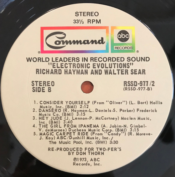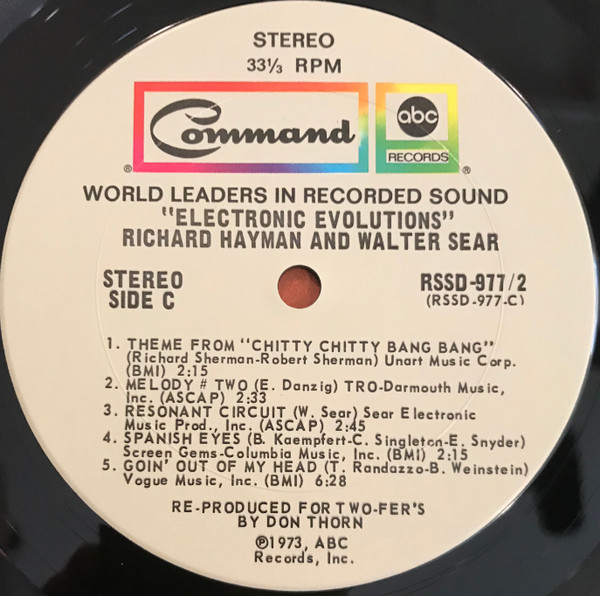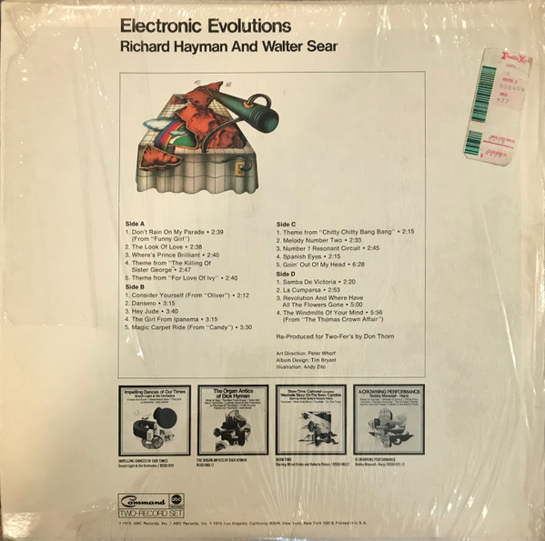 Richard Hayman & Walter Sear2LP。Genuine Electric Latin Love Machineでおなじみの作曲家Richard Hayman。噂ですがムーグものに関しては実際はWalter Searがほとんどすべてをやっていたらしい。そんなビミョーな二人名義のアルバム。本作は生楽器の比率がかなり高く、Haymanも頑張っておりますよ(たぶん)。 genre = 電子ポップ Pop Electronics