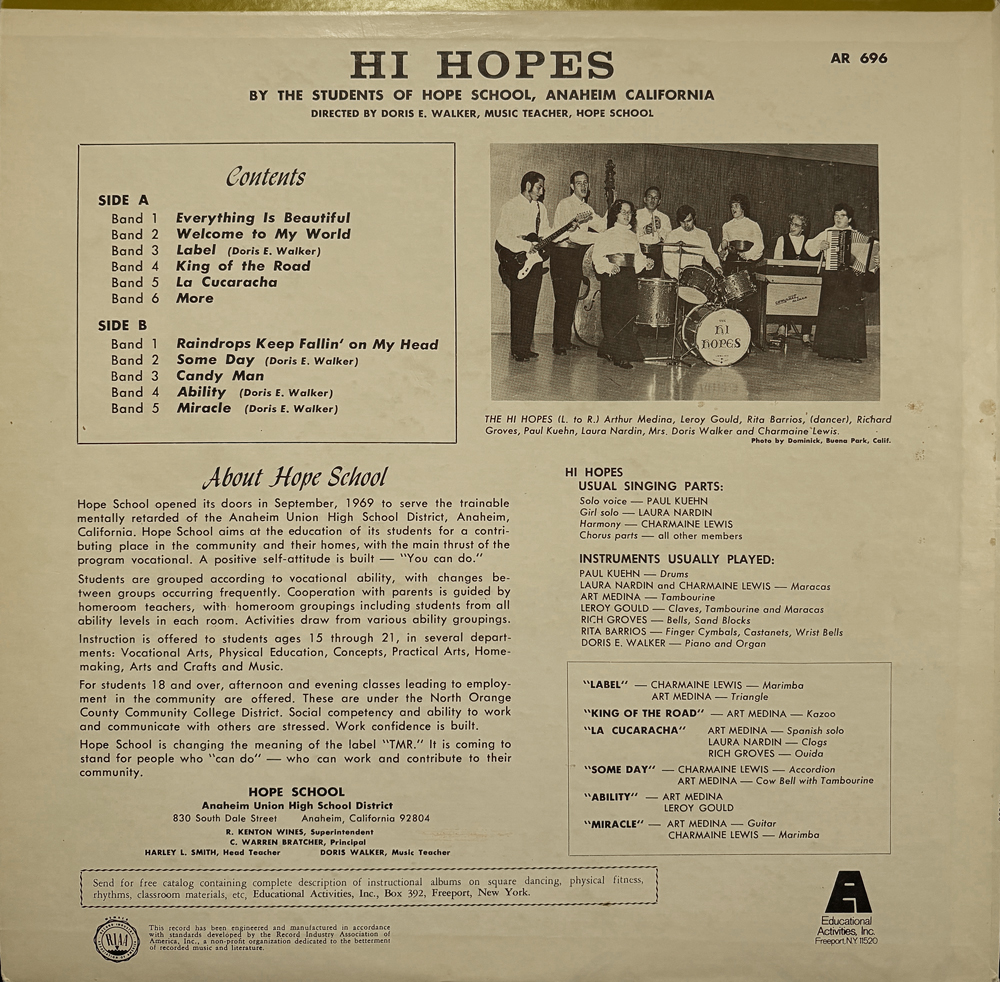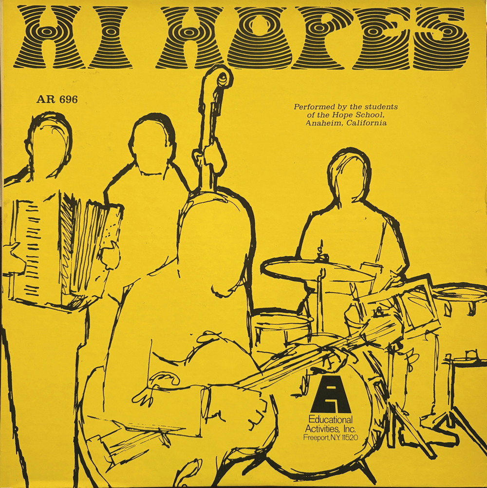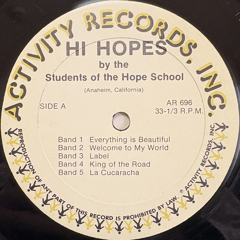 アナハイムの障害者専用学校「ホープ高校」の生徒によって結成されたHi Hopesは、ろうあ、ダウン症、知恵遅れなどの様々な障害を乗り越え、現在まで十枚以上のアルバムを出し続けている。アナログ盤は数が少なく、世界中の好き者だちが探している。76年にリリースされた本作は、支援者であるJohn Higginsなどが障害者たちをゲストに制作した番外編ともいえる一枚。本当にせつない名曲A1、期待通りのヘロヘロ女性ボーカルが聴けるB4、意味のないパンニングが楽しいB5など必聴!