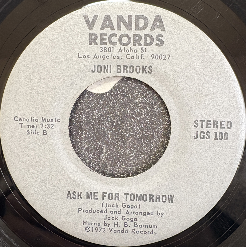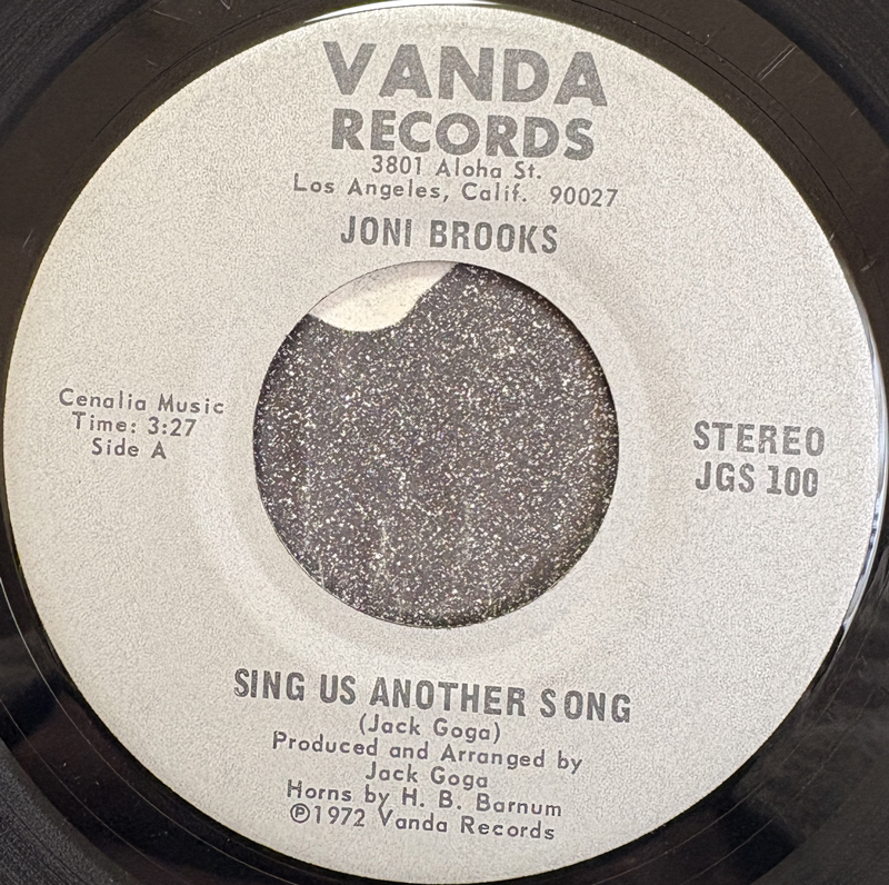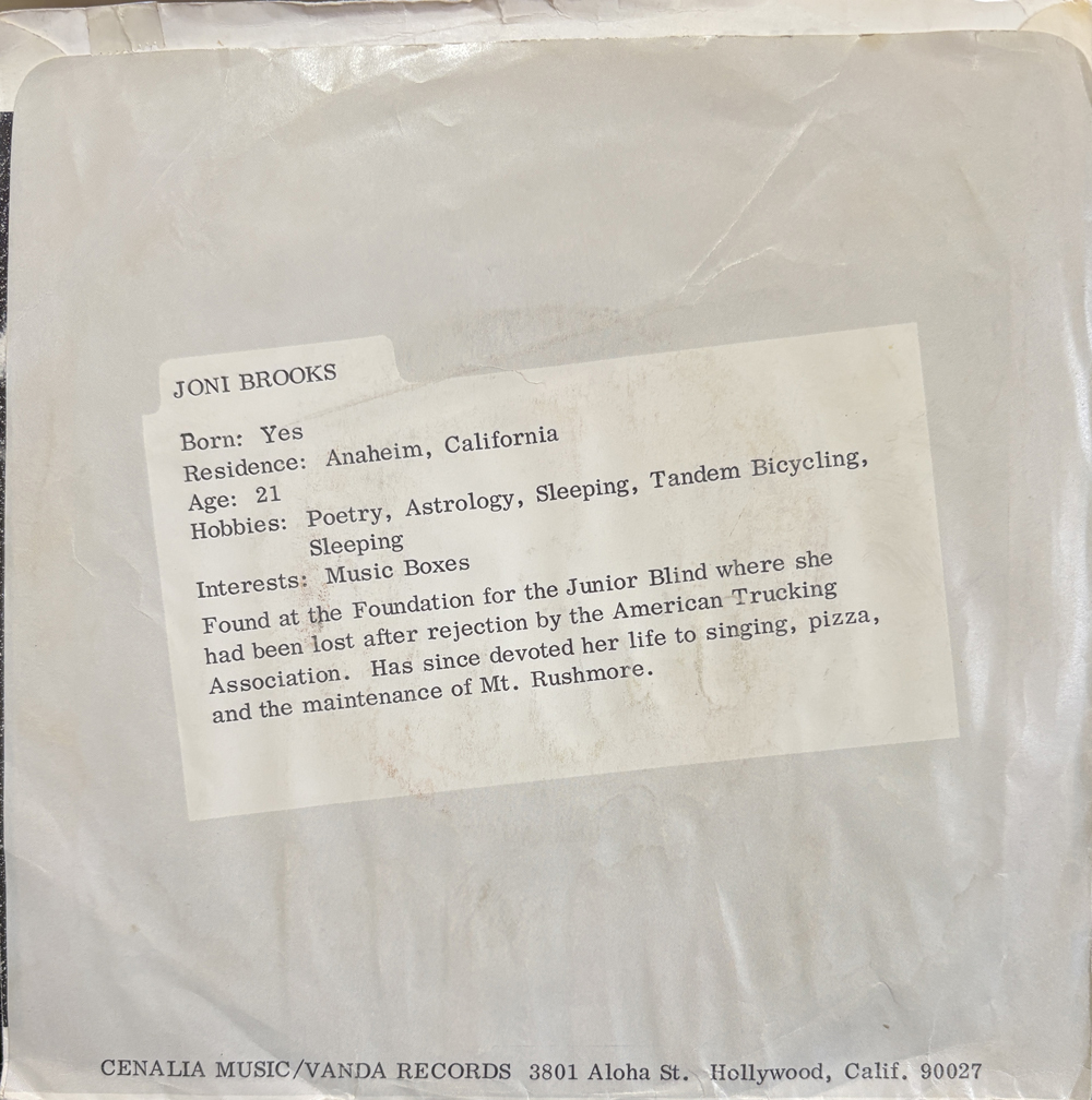 アシッドフォーク文脈でアルバムが10万越えのプレミア盤になっている盲目の女性シンガーJoni Brooksが、2年後にひっそりリリースしたシングル。まだ21歳なのね。B面曲がとても美しいソフトロックナンバー。両面作曲編曲はモータウンお抱え作家で、その後殺人で収監中に死亡したJack Goga。