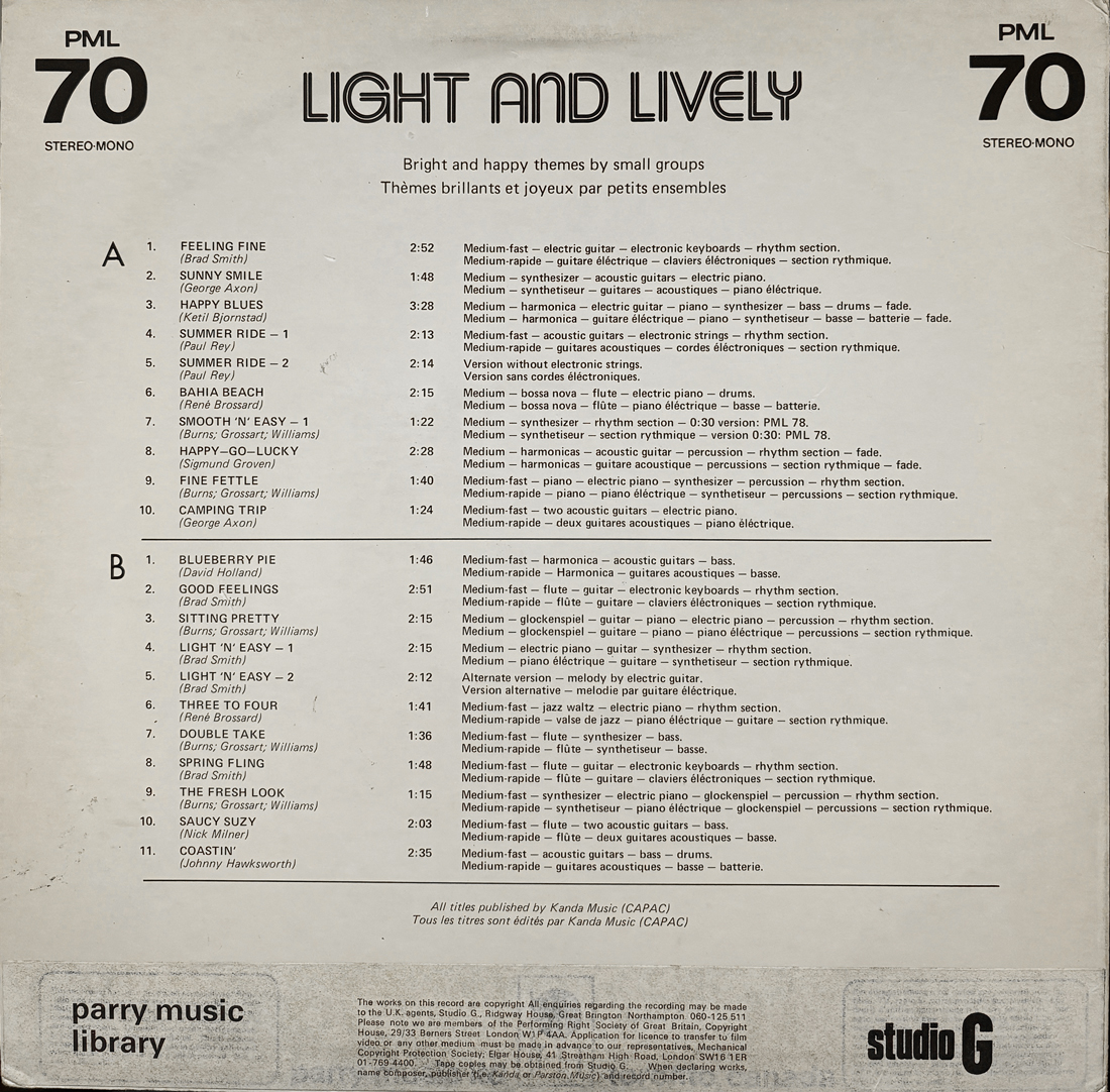 Reg Gibson / The J-J's / Dick Syncona Smith / Satin Sheetsラジオ・カナダのレーベルからリリースされたプロモーション・オンリーのアルバム。4アーティストが4曲ずつ収められています。Dr.Musicを始め様々なアーティストの作品に参加しているパーカッショニストDick Smithの"Somebody Done Somebody Wrong Song"、トロンボーン奏者Rob McConnell率いるSatin Sheetsによるムーディな"Feel Like Makin' Love"や"Big Yellow Taxi"、ソロでもリリースのあるシンガーKaren Marklingerを擁するThe J-J'sのオリジナル曲"Baby"などどの曲もこのアルバムでしか聴けません。全体的にソフトロックのアルバムではないのですが、カナダらしいコーラスものが魅力の一枚です。 #17033