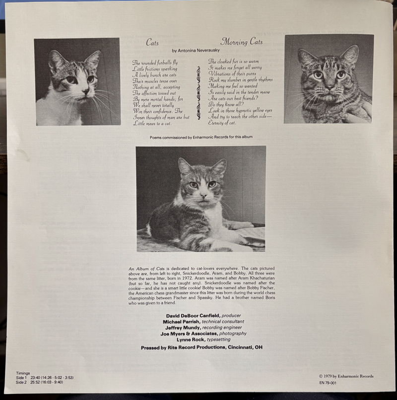 アメリカの正統派現代音楽作曲家による「猫のアルバム」。ライナーに詳細が書かれているが、実際に猫の仕草や習慣をモチーフに、場合によっては猫が弾いたピアノのフレーズや鳴き声の録音テープまでを使って、愛猫との生活を表現している。硬派の現代音楽と猫の組み合わせのギャップが非常に楽しいです。