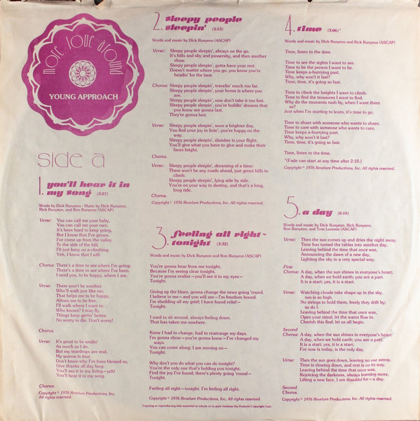 Young Approachグループもレーベルもこれ一枚という謎のCCMソフトロックグループ。ニューヨークを中心に活動していたようです。Dick Runyeonアレンジによる完璧な混声コーラスワーク、凄腕ミュージシャンの参加による高い演奏力など、まさにサンシャインポップの幸福感を詰め込んだようなアルバムです。 genre = CCMソフトロック CCM Sunshine Pop