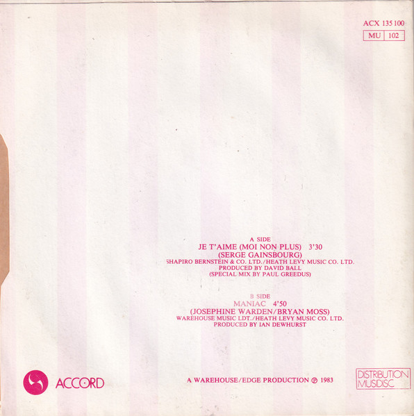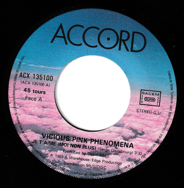 Vicious Pink Phenomenaソフトセルのバックコーラスもやっていたフランスの男女エレポップバンドによるゲンズブール「ジュテーム」カバー。コードやメロディが違ってたりもしますが、そつないカバー。むしろB面のオリジナル曲の方が、ニューロマ的なサウンドと掛け合いボーカルで、いちゃいちゃ感が高いかもしれません。 genre = ニューウェイヴ以降 New Wave