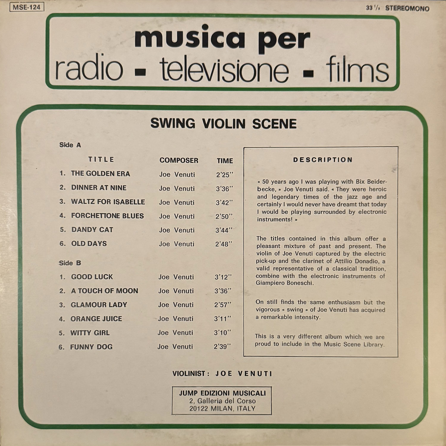 Joe Venuti, Giampiero Boneschi伊盤。1920年代から活躍したジャズヴァイオリンの草分け的存在Joe Venuti。幼なじみでもあるジャズギターのパイオニアEddie Langとの活動は、その後のジャンゴ・ラインハルト&ステファン・グラッペリにも多大な影響を与えましたが、日本ではティンパンアレーにも影響を及ぼしていました。1975年ラグの研究をするためにVenutiとLangのレコードを仕入れてきた細野晴臣さんと鈴木茂さん。その成果が「キャラメル・ラグ」になったとか。同じ頃イタリアでVenutiが録音していたのが、電子音楽家Giampiero Boneschiとの共作によるこのアルバム。Boneschi独特の洗練された電子音楽をバックに、洒落たスウィングジャズを聴かせてくれます。本当に驚きの鬼レアな1枚ナリ!超名盤!嫁を質に入れてでも買うべし! #16701