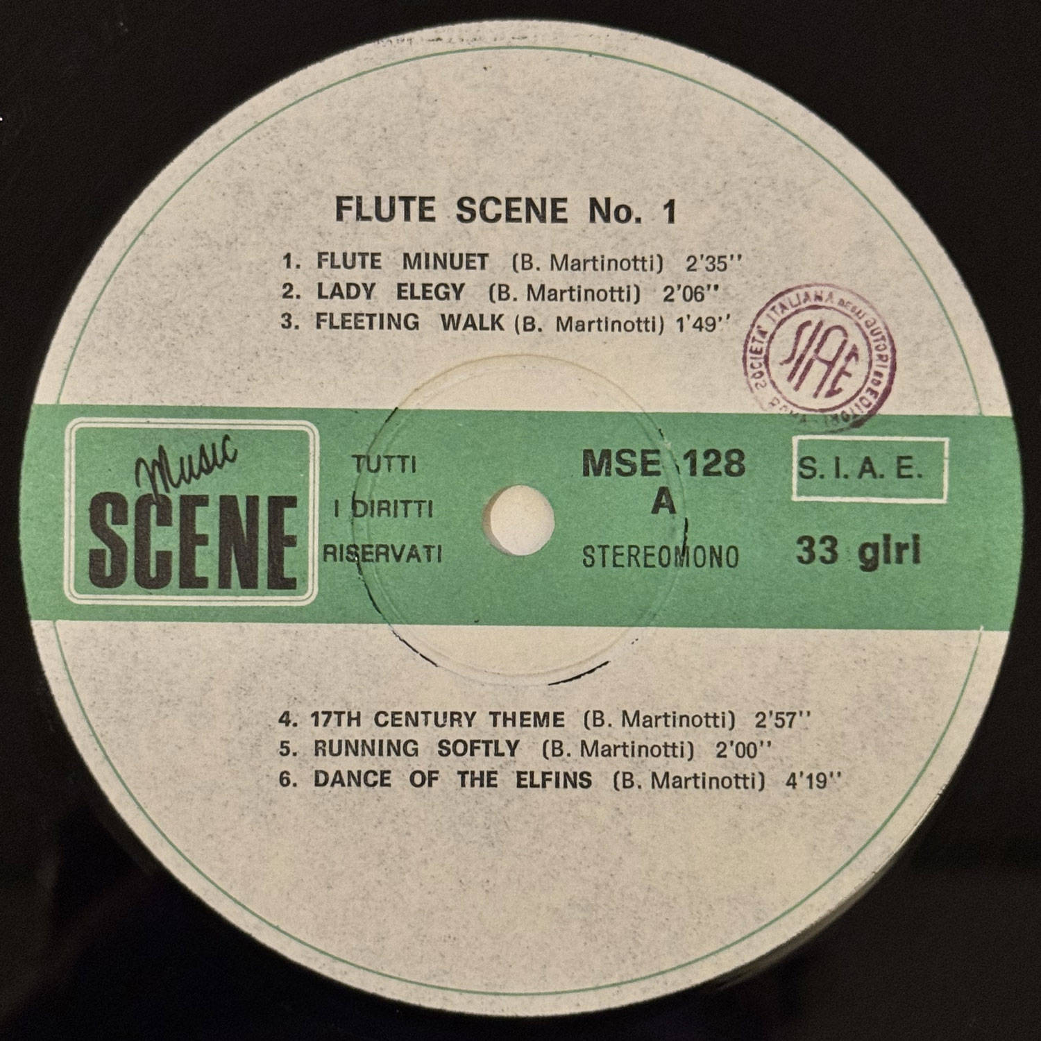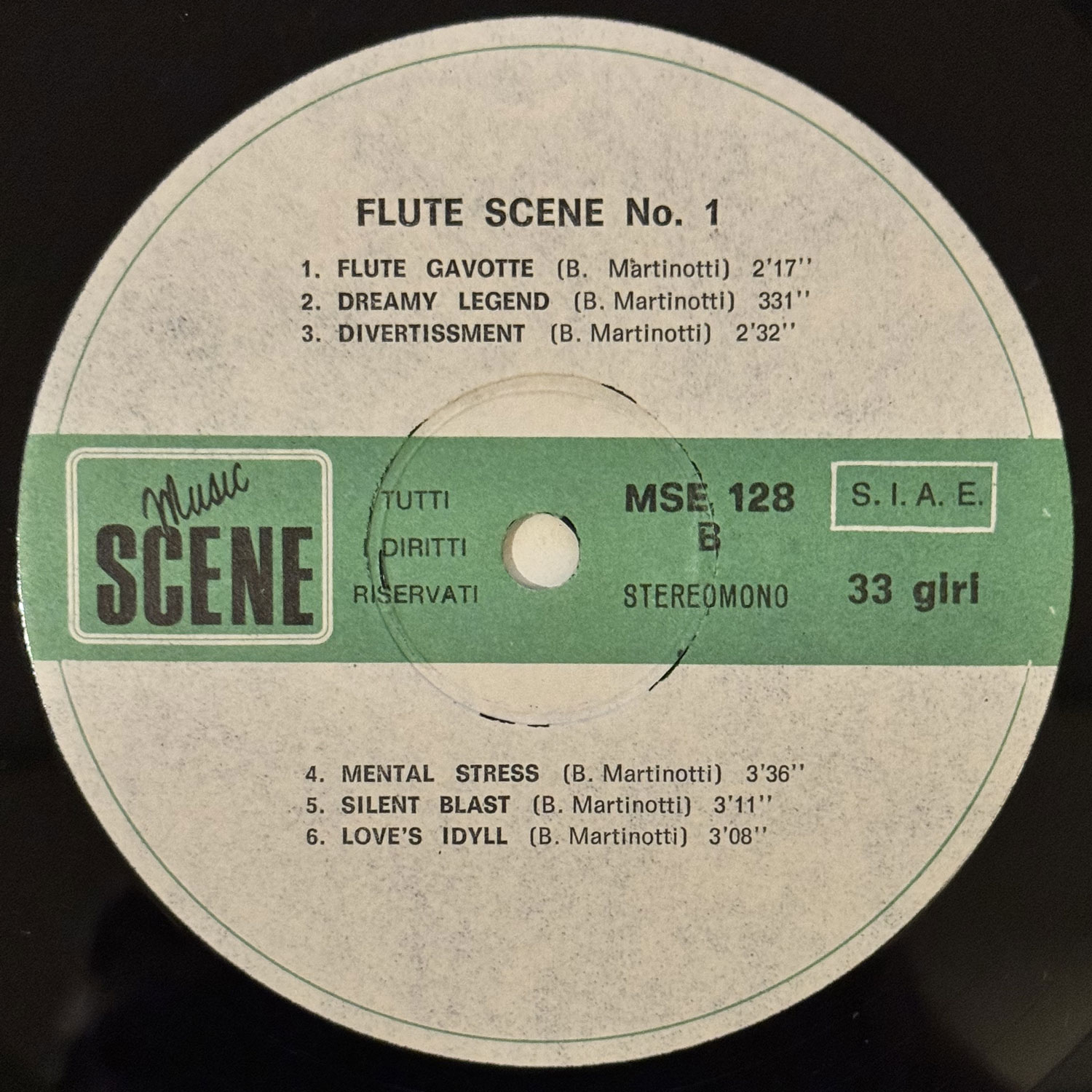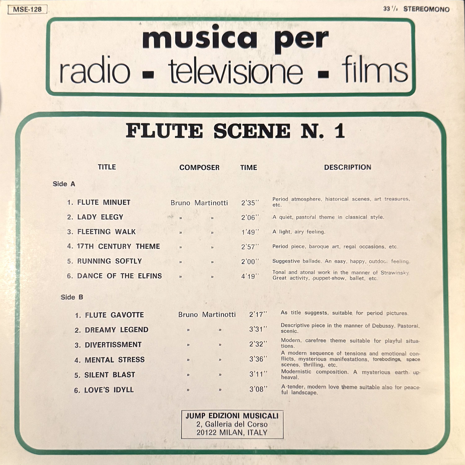 Bruno Martinotti伊盤。イタリアのミラノ放送交響楽団の主席フルート奏者も務めたブルーノ・マルティノッティによるライブラリー。数曲電子音をバックにしているトラックがあるが、ジャンピエロ・ボネスキとのデュオアルバムも発表している関係もあるため、バックトラックはノンクレジットながらボネスキが関わっていると思われます〜 #16703