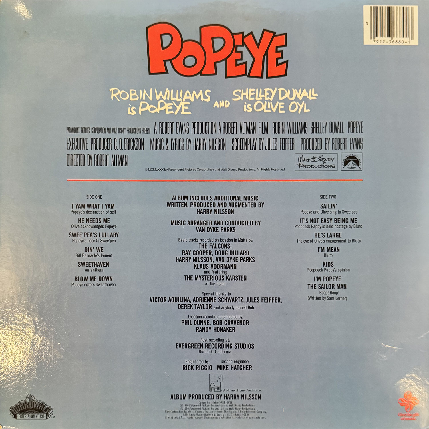 OST (Harry Nilsson)Nilsson のソングライトと、Van Dyke Parks のアレンジのホームラン サントラ。インストではなく、全曲ポパイ (ロビンウィリアムズ) やオリーブ (シェリーデュヴァル) ら映画主演陣がファニーに歌うドリーミーアルバム。おなじみの "I'm Popeye the Sailor Man" も演っちょります。fe. Klaus Voormann。 genre = 映画・TV Movie, TV