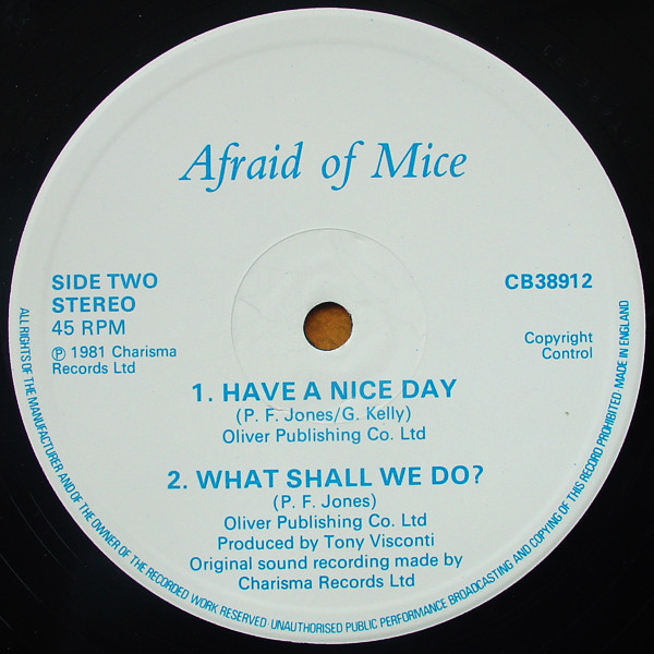Afraid Of Miceトニー・ヴィスコンティがプロデュースしたリバプール出身のNW・パワーポップバンド。アルバムや7インチはポップな曲が多く、正直ソノタ的ではないのだが、この12インチにだけ収録されている「Have A Nice Day」という楽曲だけは光り輝いている。アルバムにも未収なので是非。 genre = ニューウェイヴ以降 New Wave