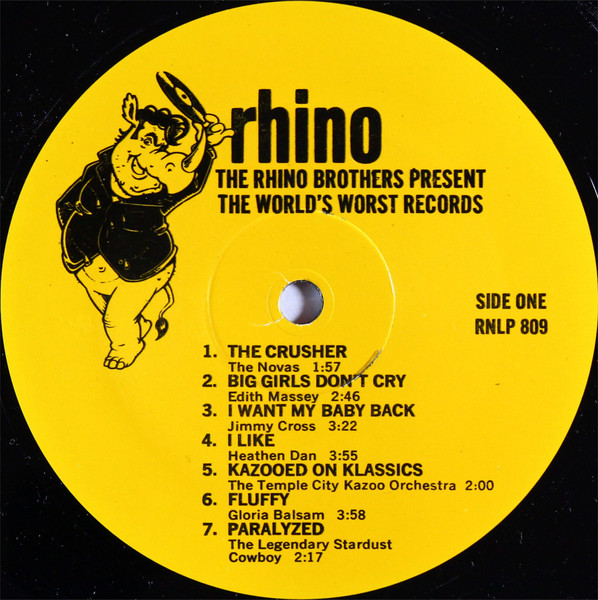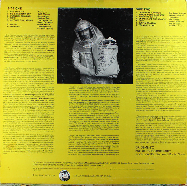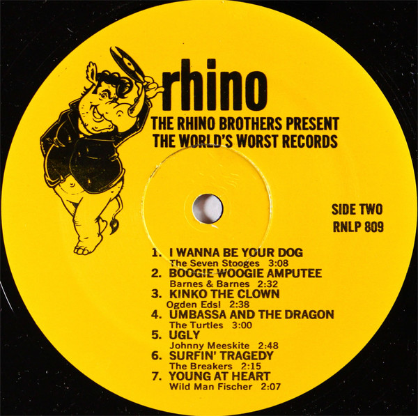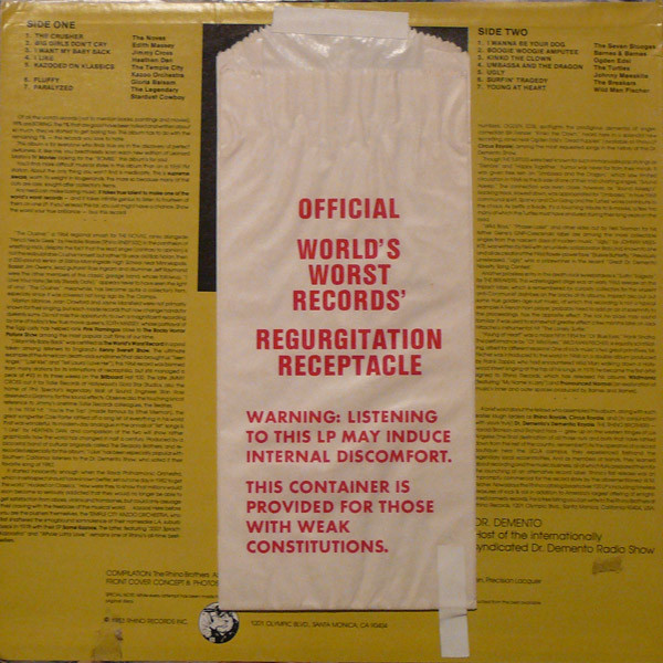 V.A.ライノレコーズ創設者 The Rhino Brothers が、ノベルティー博士 Dr. Demento らの協力によって、音楽のまずいもの好きに送る、夢のワーストソング コンピレーション第一弾。The Crusher (The Novas)、Paralyzed (The Legendary Stardust Cowboy) といったカルトクラシックから、ライノレーベル系の T.C. Kazoo Orchestra、Wild Man Fischer らを交え、ジョンウォーターズ女優 Edith Massey、音痴もの Gloria Balsam らの珍作まで各種。NW/パンクな時代感を反映させつつライノらしい陽気な選曲となっておりやす。 #16684