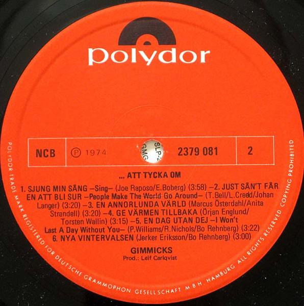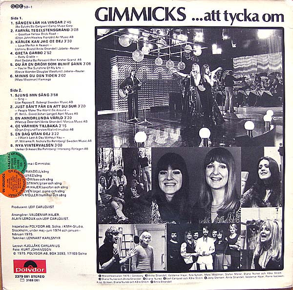 Gimmicks女性ツインヴォーカルを擁したスウェーデンのジャズポップグループ、ギミックス。You're the Sunshine of My Life、I won't Last a Day Without You、Sing といったエエ曲をスウェーデン語で聴かせてくれます。Melodifestivalen '75 参加曲 Sangen Lar Ha Vingar も収録。 genre = 欧州ジャズ・ポップス Europe Jazz, Pops